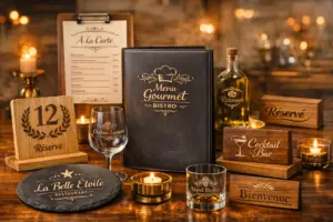👉 Menus gravés, planches personnalisées, numéros de table, étiquettes premium, verres marqués, panneaux d’accueil… Tout est possible, en petites ou grandes séries.